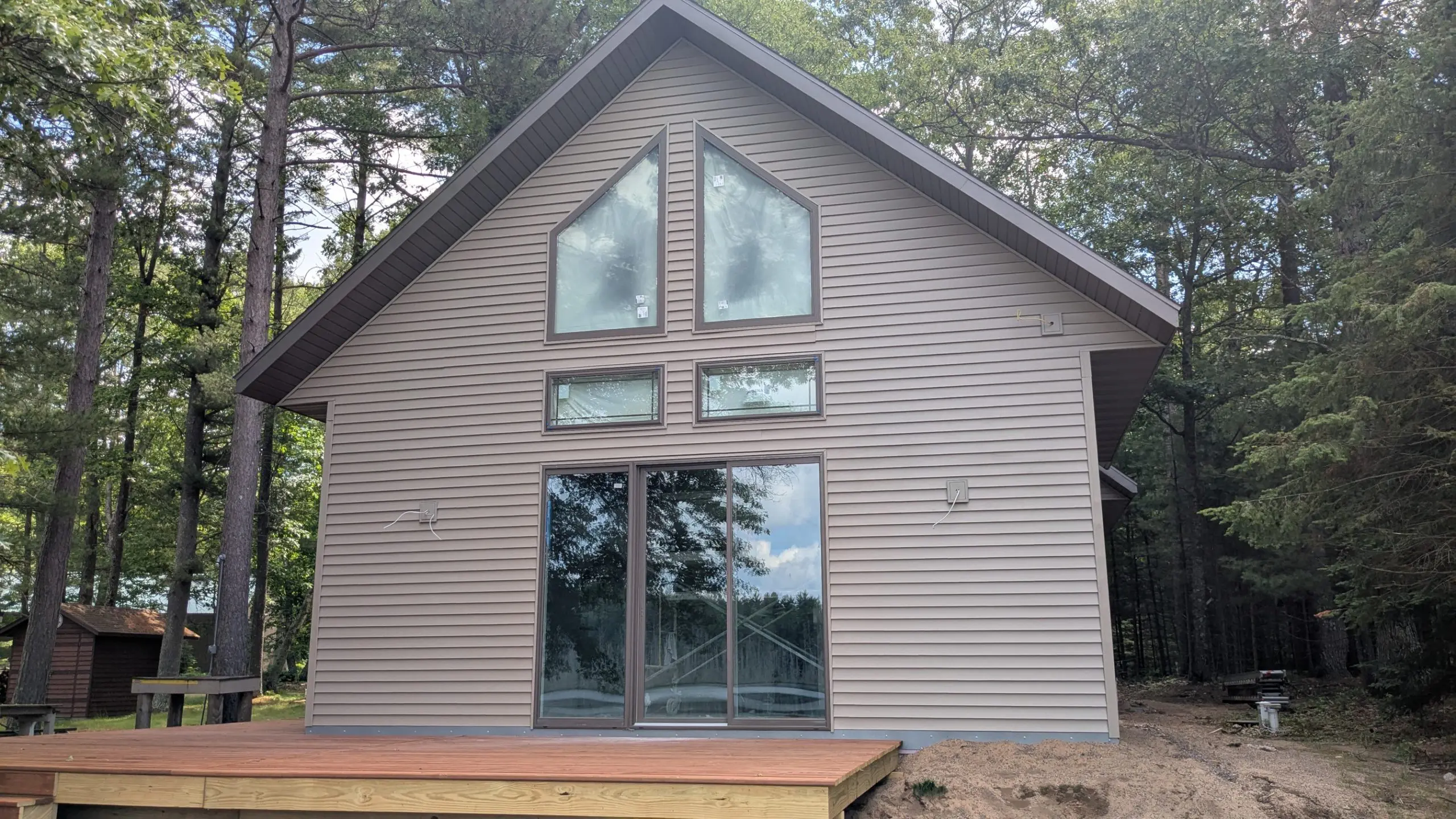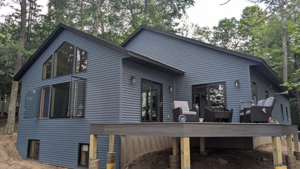 This lake house is 100 percent done after installing the entry door we ordered nearly one year ago, a few supply-chain issues from COVID yet. Black siding, roof, windows, black everything except the cedar deck and wood tone doors. Contact us if you're thinking of building a home or cottage in the Northwoods!
